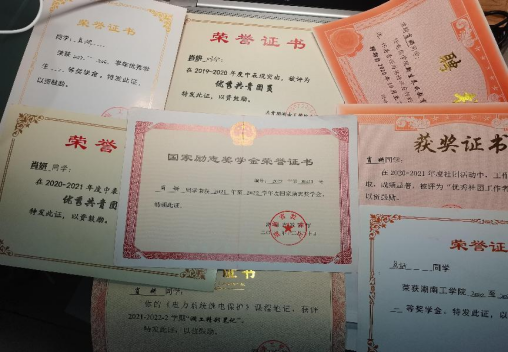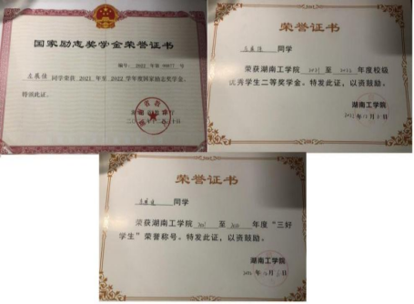 在校期间,曾获得国家励志奖学金、校级一等奖学金两次、校级三等奖学金、校级三好学生、校级优秀团干、校级优秀团员等;在课外生活中,曾多次参加社团活动及比赛,获得“圆融杯”电子设计竞赛校级三等奖、机械创新设计大赛校级三等奖。并在新生才艺大赛上获得最佳团体奖、最佳组织奖。