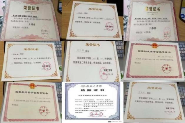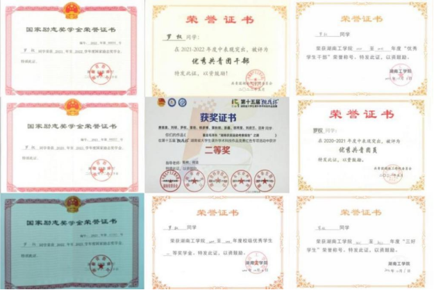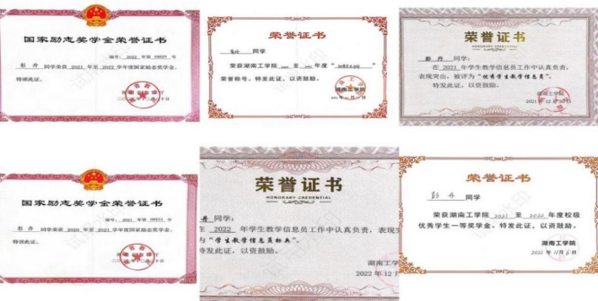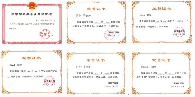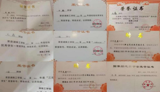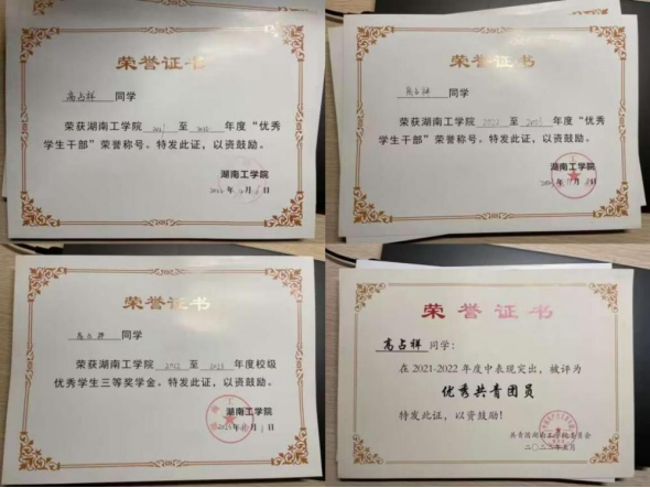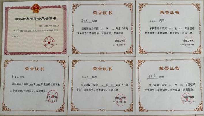 在校期间曾三次荣获国家励志奖学金、两次校级一等奖学金、一次校级二等奖学金,此外还获得了“三好学生”“优秀学生干部”“优秀共青团员”“优秀共青团干部”“优秀裁判”等校级荣誉称号。获得2023年第十五届“桃战杯”湖南省大学生课外学术科技作品竞赛红色专项省级二等奖,2022年beat365正版唯一官网必一“互联网+”创新创业大赛校级三等奖。