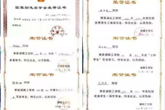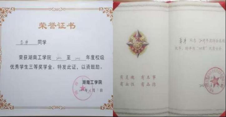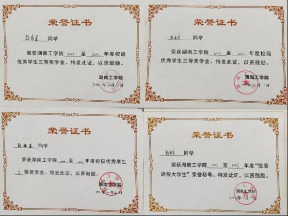 在校期间获“校三等奖学金”3次和“优秀退役大学生”。