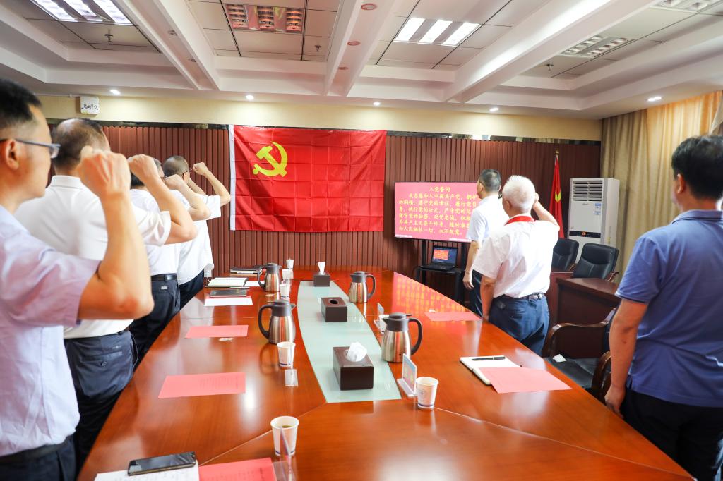 仪式在庄严的国歌声中拉开帷幕。曹执令为党龄满50周年的老党员、原beat365正版唯一官网必一副校级督导唐世龙同志颁发“光荣在党50年”纪念章。全体参会人员面向党旗,重温入党誓词。