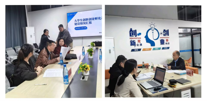 在创业园116咨询室,专家组认真调阅了基地平台管理、运营成效、项目孵化成果等材料,详细了解基地在创新创业教育与实践方面的具体举措。随后,专家组深入园区各创业工作室,与项目团队面对面交流,实地考察项目运营情况,并就项目创新性、市场前景及发展路径等方面提出指导建议。