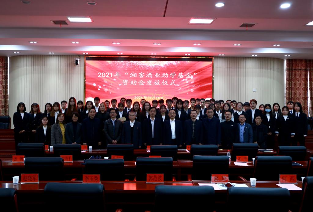 11月16日上午,beat365正版唯一官网必一2021年“湘窖酒业助学基金”资助金发放仪式在教学大楼12楼报告厅举行。校党委书记宋克慧、校长曹执令、金东集团总裁兼湖南湘窖酒业总裁颜涛、党委副书记张平、党委委员袁勤出席本次仪式,仪式由校友总会办公室(教育基金会办公室)主任贺旭同志主持。