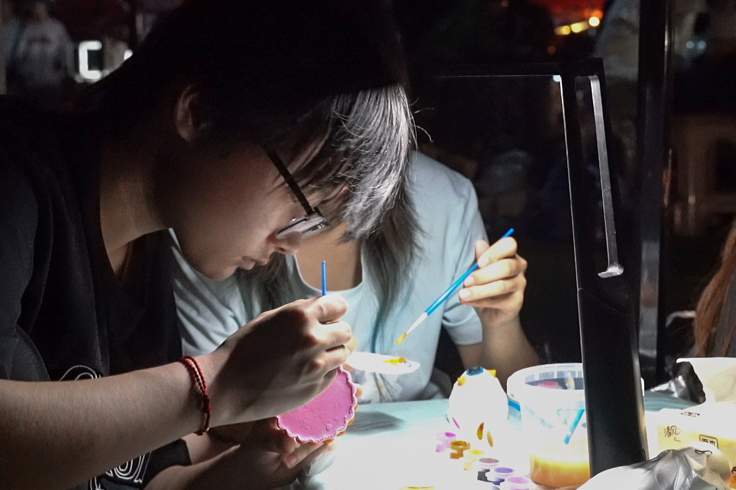 “非常高兴能为我们的学长、湖南湘窖酒业总裁颜涛先生现场设计了3幅作品,他很满意,都买下来了。”摊主2022级产品设计专业王同学说。