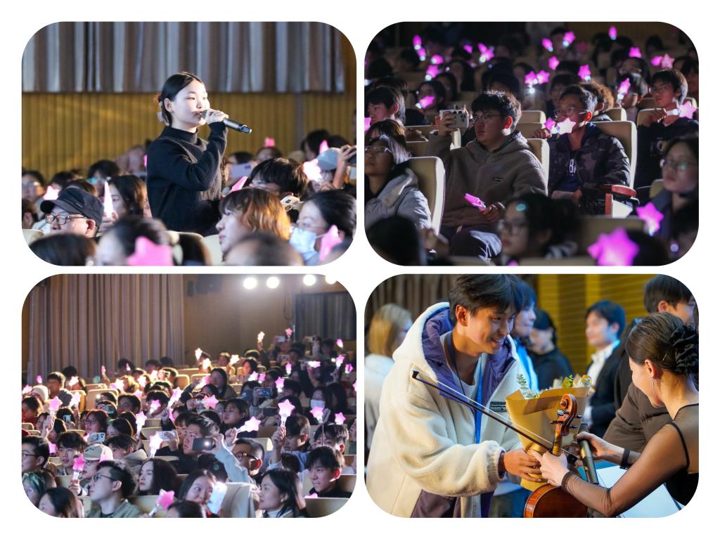 音乐会的尾声,在现场观众热烈的掌声中,乐团返场演奏了《这世界那么多人》。最后,在乐团的演奏下,全场师生共同挥动手中的星星灯,现场高声齐唱《生日快乐》,共同唱响对学校的热爱与对未来的期许,更是将现场气氛推向了高潮,也为这场音乐会画上了圆满的句号。