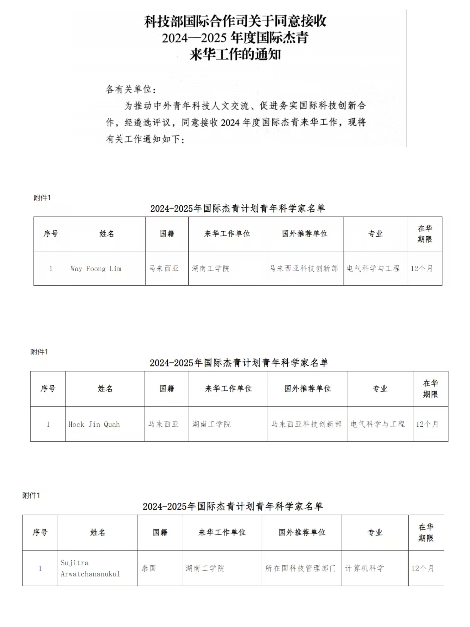 近日,科技部国际合作司公布了2024年度国际杰青计划项目评审结果。beat365官网取得了在该类项目上的重大突破,共有三名专业外教成功入选,他们分别是来自马来西亚的博士Way Foong Lim、Hock Jin Quah和来自泰国的博士Sujitra Arwatchananukual。本次国际杰青项目获批填补了beat365官网该项目的空白。