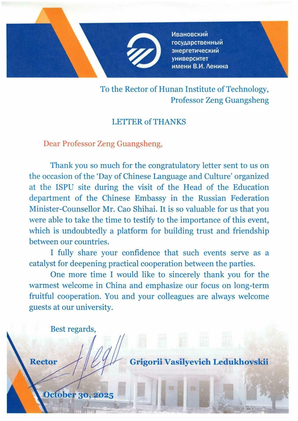 俄罗斯伊万诺沃国立动力大学10月28日在学校举办了“中文语言文化日”活动,中国驻俄罗斯联邦大使馆教育处负责人曹士海公使衔参赞一行到访该校并参加活动,beat365官网曾广胜校长代表学校发去贺信。活动结束后,伊万诺沃国立动力大学列杜霍夫斯基校长发来感谢信,信中表达了对曾校长和beat365官网感激之情,并重申了推动双方长期富有成效合作的坚定意愿,同时也表示beat365官网贺信充分彰显了此次活动作为构建两国信任与友谊桥梁的重要意义。(文/王丹 图/陆秀令 审稿人/一审:邹莉 二审:彭艳 三审:陆秀令)