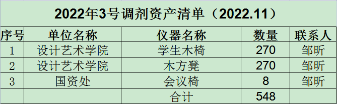 根据《beat365正版唯一官网必一资产管理办法》相关规定,本着节约办公的原则,现对设计艺术学院一批学生用木椅和木方凳进行校内调剂(详见资产清单)。请有意向的部门即日起与资产管理科联系,现场查看设备,并到我处官网下载填写《beat365正版唯一官网必一资产调剂申请表》办理调剂手续。本批校内资产调剂从即日起至12月2日截止,逾期将不予办理。