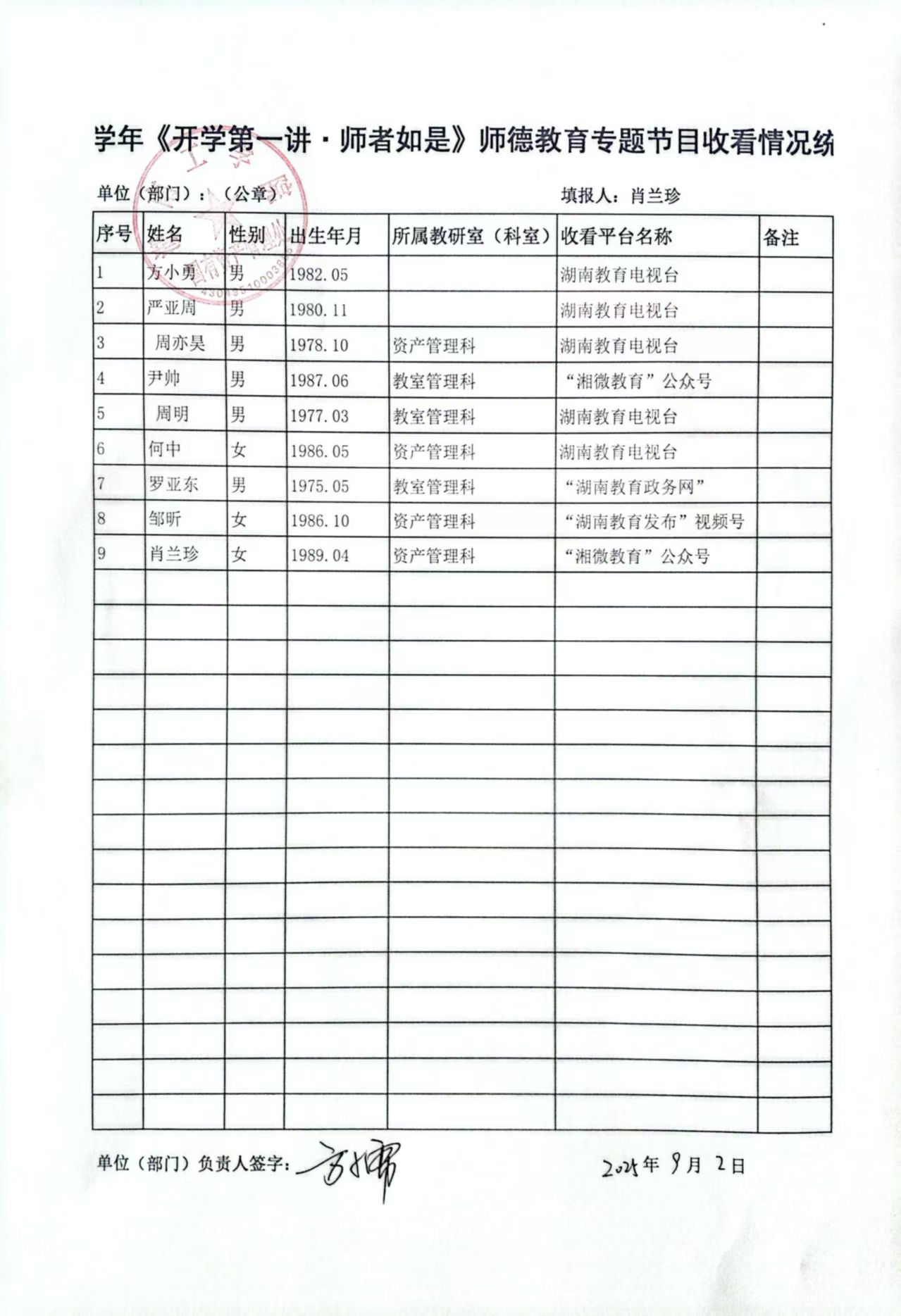 为贯彻落实教育家精神铸魂强师行动,加强师德师风建设,培养造就新时代高水平教师队伍,接学校通知,9月1日(星期一)20:00国资处组织了本部门全体教职工收看2025学年《开学第一讲·师者如是》师德教育专题节目,现将收看情况予以公示,公示3个工作日(9月3日-9月5日)。