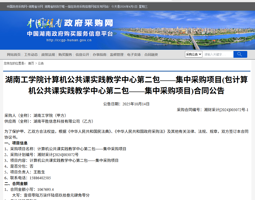 湖南政府采购网查询方式:官网->右上角搜索或中部“更多”->项目名称、大概时间段(建议查询时间段在一年以内),例如查询采购项目名称为“计算机公共实践教学中心”的项目,在公告标题中输入“计算机公共实践教学”字样,大概时间为2025年3月31日-2026年4月1日,查询过程如下: