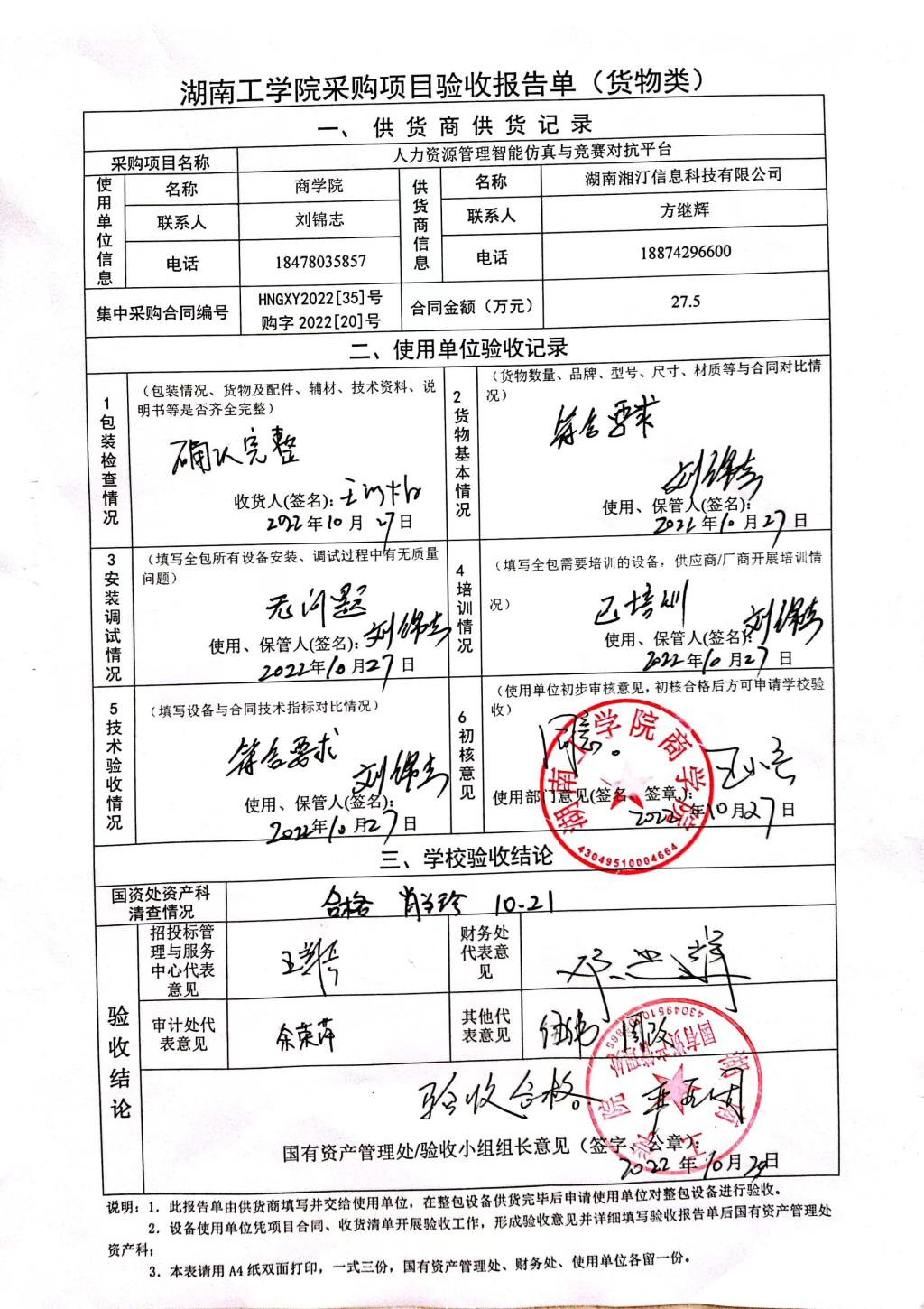 根据国有资产管理处对采购项目的验收安排,2022年10月21日国有资产管理处组织招投标管理与服务中心、审计处、财务处、教务处、学科建设与发展规划处以及使用部门代表对供应商的货品进行现场验收。