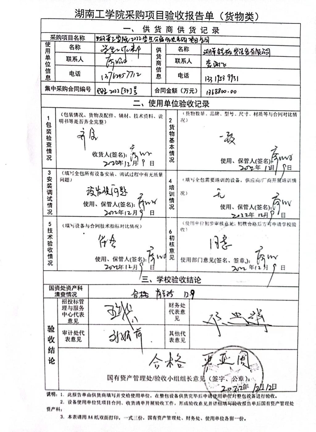 2022年12月关于HNGXY2022【72】号 购字2022【34】号采购项目验收情况公告