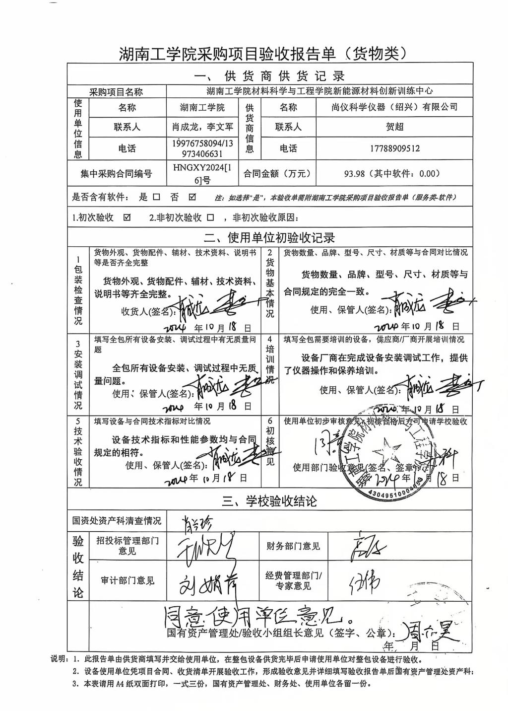 2024年10月关于HNGXY2024【16】号 购字2024【6】号采购项目验收情况公告