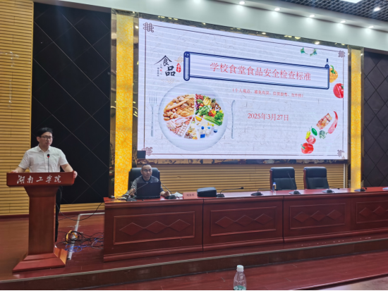 为提升校园食品安全水平,加强校内餐饮从业人员的专业能力,beat365官网后勤基建处,国有资产管理处联合衡阳市市场监督管理局于2025年3月27日晚开展食品安全培训,衡阳市食品监督科科长蒋受楚受邀参与,校内食堂、经营性门面全体从业人员参与,约300人到场。