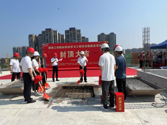 在现场众人的见证下,出席仪式的领导挥动铁锹,浇筑最后一方混凝土,为材料科学与工程实训楼工程主体结构封顶。