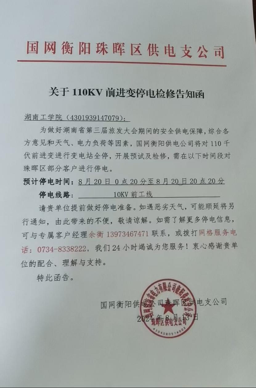 国网衡阳供电公司2024年8月20日0点20分-20点20分对前进变电站升级改造,beat365官网前工线将停止供电,为保障学校正常用电,我处将同期进行倒闸操作,相应的停电时间及停电区域如下: