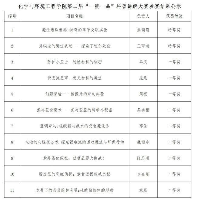 为营造全社会热爱科学、崇尚科学的良好氛围,6月6日晚7点,化学与环境工程学院在1410隆重举行第二届“一院一品”科普讲解大赛。化学与环境工程学院副书记蔡玲、副院长刘宁、辅导员冯智发、辅导员陈凌霄出席并担任本次竞赛的评委,团学会主席团及各部门部长参加了本次大赛。