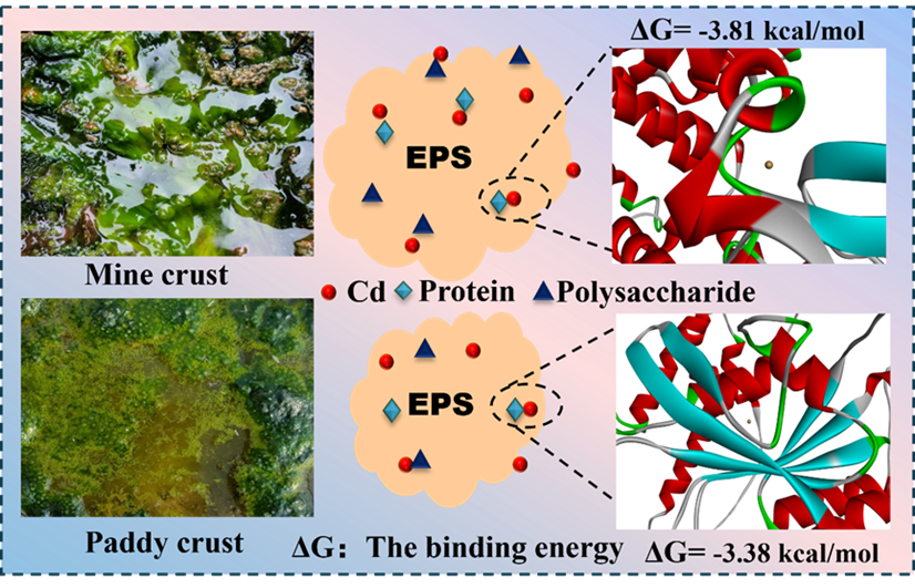 研究通过实验证实,EPS的去除会显著降低两种生物结皮对镉的吸附效率,凸显了EPS的关键作用。动力学研究表明,虽然两种结皮中的胞外多糖在吸附初期表现出更快的镉结合速率,但胞外蛋白因其拥有更多的可用表面位点,最终表现出更强的整体吸附能力。分子对接模拟结果为此提供了分子层面的有力支持:MC的细胞外蛋白与镉的结合能(3.98 kcal/mol)明显高于(即结合更强)PC的细胞外蛋白(3.52 kcal/mol)。