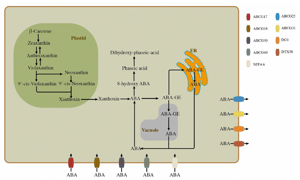 图1 植物中脱落酸生物合成、分解代谢和运输通路