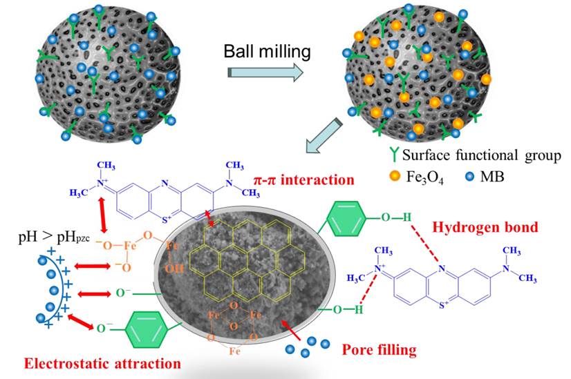 近日,我院王蓓博士在《Molecules》(中科院二区)发表了题为《Ball Milling and Magnetic Modification Boosted Methylene Blue Removal by Biochar Obtained from Water Hyacinth: Efficiency, Mechanism, and Application》的研究论文。球磨法作为一种高效、适用性广、环境友好的制备技术,在新型材料合成领域展现出了巨大的应用潜力,特别是在生物炭的改性研究。虽然球磨生物炭作为吸附剂具有许多优点,但较细的活性炭粉难以分离和回收利用。本研究以水葫芦为原料,通过球磨和磁化改性制备生物炭用于吸附亚甲基蓝,并揭示了改性生物炭强化亚甲基蓝吸附的机理(图1)。研究发现低温热解改性生物炭表现出优异的吸附性能和再生性。球磨显著提高了生物炭的比表面积、孔容量和官能团,基于DFT计算,生物炭上的-OH官能团表现出较高的亚甲基蓝结合能力。
