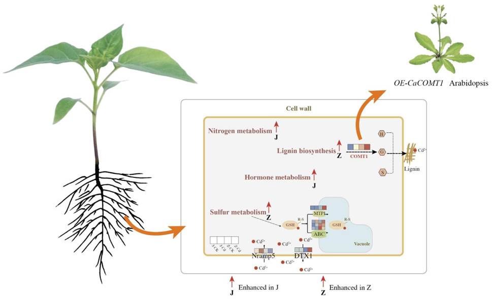 辣椒品种间镉积累差异的分子机制尚不清楚。本研究对高镉(J)和低镉品种(Z)在镉浓度分别为0和0.4 mg/L的条件下进行了根系转录组比较分析。结果表明,高镉品种通过提高Nramp5的表达来促进根对镉的吸收,并通过增加NIR1、GLN1和IAA9等基因的表达来消除镉毒性。低镉品种通过增强细胞壁木质素合成基因PAL、COMT、4CL、LAC和POD以及镉转运蛋白ABC、MTP1和DTX1来减少镉积累。在拟南芥中,硫代谢相关基因的表达升高,可能有助于其解毒镉的能力。为了调查CaCOMT1的功能,我们构建了一个拟南芥过表达系(OE-CaCOMT1)。结果表明, OE-CaCOMT1将木质素含量显著提高了38–42%,镉向地上部分转运减少了32%。本研究通过转录组分析为辣椒镉积累机制提供了全面的了解。此外,本研究阐明了CaCOMT1的关键功能,为低镉蔬菜的安全生产提供理论依据(图1)。