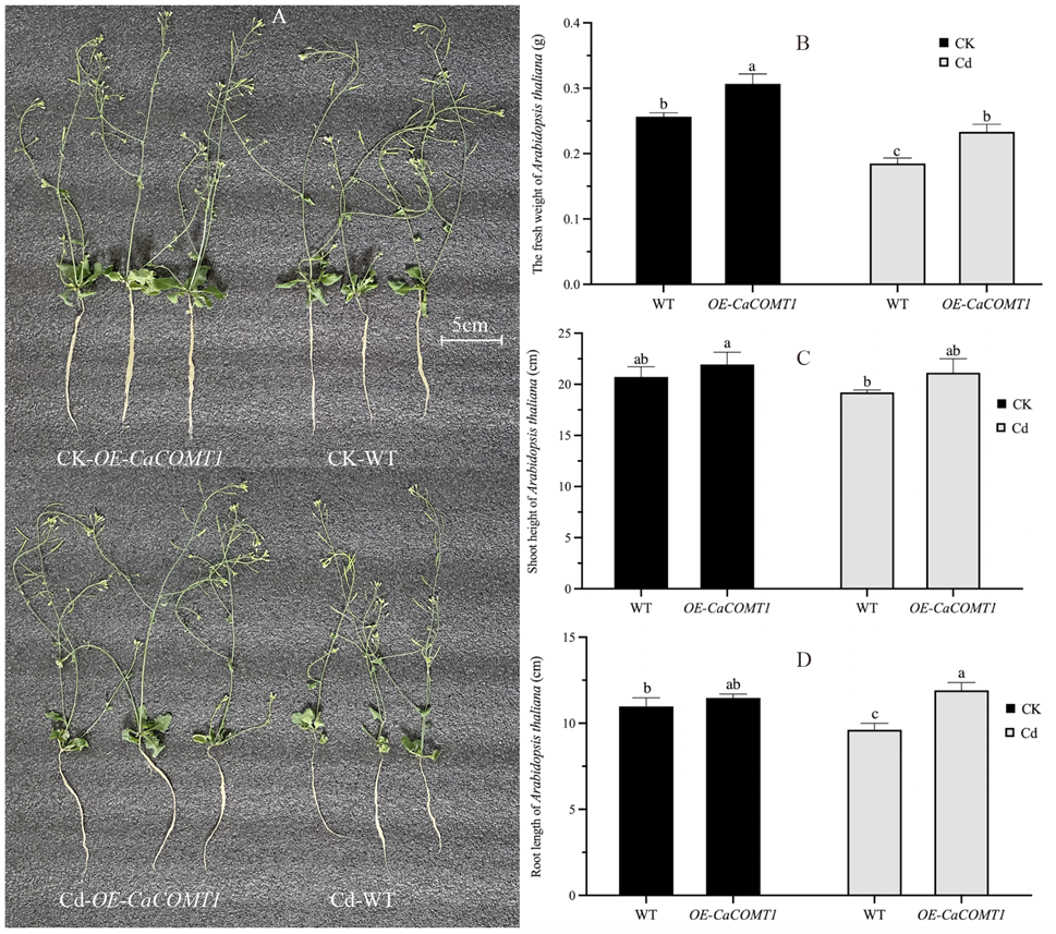 在对照条件下,野生型拟南芥中检测不到CaCOMT1的表达,只有AtCOMT1可以被检测到(图4B)。对照下,在OE-CaCOMT1拟南芥中CaCOMT1的表达量比AtCOMT1高80倍(图4B)。此外,在OE-CaCOMT1拟南芥中,AtCOMT1的表达量比野生型拟南芥显著降低32%(图4B),说明CaCOMT1可以抑制拟南芥中AtCOMT1的表达。镉处理显著提高了野生型和OE-CaCOMT1拟南芥的AtCOMT1,但CaCOMT1的表达不受影响(图4B)。