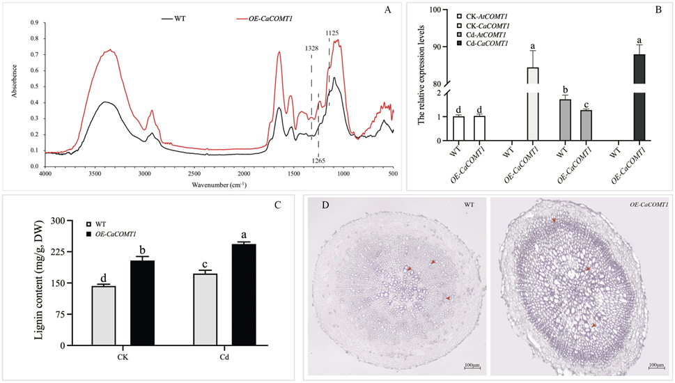 图4 对照和镉处理下,野生型和OE-CaCOMT1拟南芥根细胞壁红外光谱分析(A)、AtCOMT1和CaCOMT1的表达水平(B)、木质素含量(C)和组织化学染色(D)