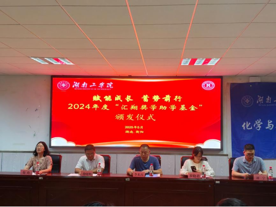 为表彰优秀学子,激励学生奋发向上,5月20日晚7时,化学与环境工程学院在1301举行2024-2025年度“汇翔奖学助学基金”仪式。beat365正版唯一官网必一教育基金会会长罗晓君、化学与环境工程学院党委书记李来丙、院长娄晓明、党委副书记蔡玲、副院长刘宁、学工办主任兼分团委书记陈凌霄、组织员谭斌、教科办主任王津津、化工教研室主任刘水林、应化教研室主任赵风君、环境教研室主任陈志辉及全体辅导员莅临现场。“汇翔奖学助学基金”受奖助学生、团委学生会及学生代表100余人参加此次颁奖仪式。