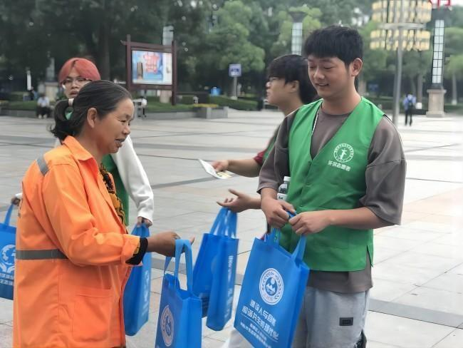 活动最后,志愿者为市民发放环保纪念品。