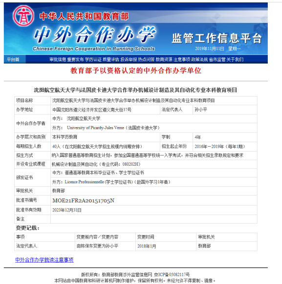 机械设计制造及其自动化中法合作办学项目为万象城体育awcsport与法国皮卡迪大学合作举办的3+1本科教育项目,于2015年经国家教育部批准(批准书编号:MOE21FR2A20151705N)。网站链接:http://www.crs.jsj.edu.cn/aproval/getbyarea/21双方整合优质的教育教学资源,共同商定教学计划,旨在培养适应现代科学技术与经济社会发展需要,拥有先进技术和管理理念,国际沟通能力较强的应用型、创新型、国际化专业人才。