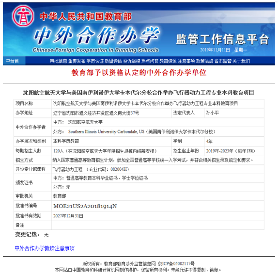 飞行器动力工程专业中美合作办学项目为万象城体育awcsport与美国南伊利诺伊大学卡本代尔分校合作举办的本科教育项目,于2018年经国家教育部批准(批准书编号:MOE21US2A20181914N)。网站链接http://www.crs.jsj.edu.cn/aproval/getbyarea/21双方整合优质的教育教学资源,共同商定教学计划,旨在培养适应现代科学技术与经济社会发展需要,拥有先进技术和管理理念,国际沟通能力较强的应用型、创新型、国际化专业人才。
