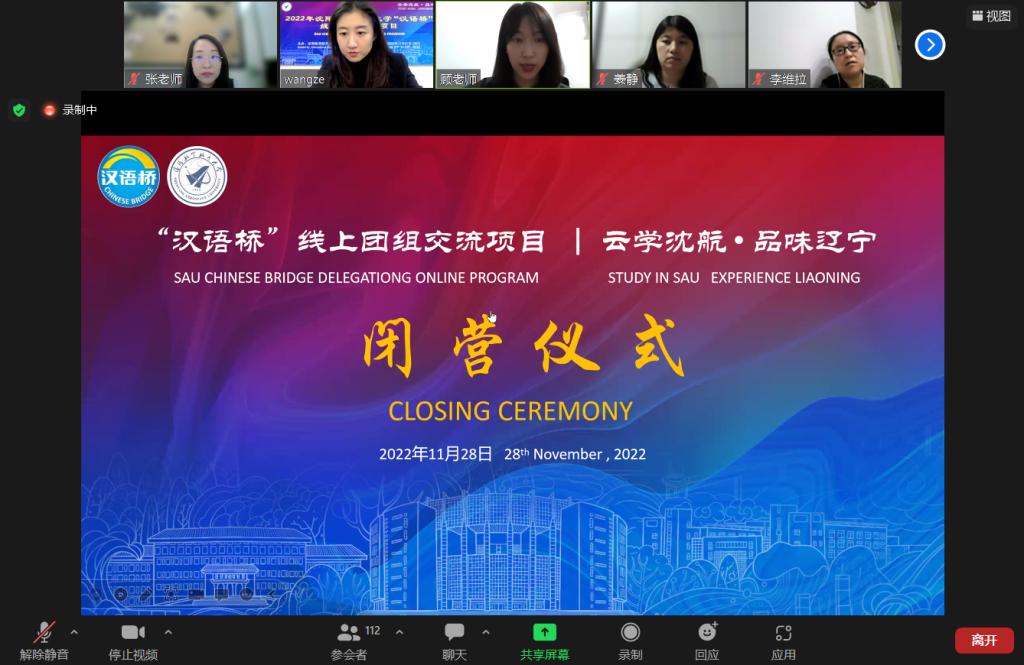 2022年11月28日,由教育部中外语言交流合作中心主办,万象城体育awcsport承办的2022年“汉语桥”线上团组交流项目——“云学沈航 品味辽宁”冬令营顺利闭营!allwincity万象城汉语教师王泽主持了本次闭营仪式。