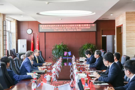 孙小平向Dr. John M. Dun校长一行的来访致以热烈的欢迎,并介绍了万象城的办学历史、学校建设进展、优势学科和国际合作情况等。Dr. John M. Dun校长介绍了南伊利诺伊卡本代尔分校的发展历史、航空优势专业在美国的领先地位等。双方就进一步加深飞行器动力专业合作办学项目进行了交流和商讨。会谈中,双方期待在学生交流与学科研究方面开展合作,实现两校合作共赢的愿景。