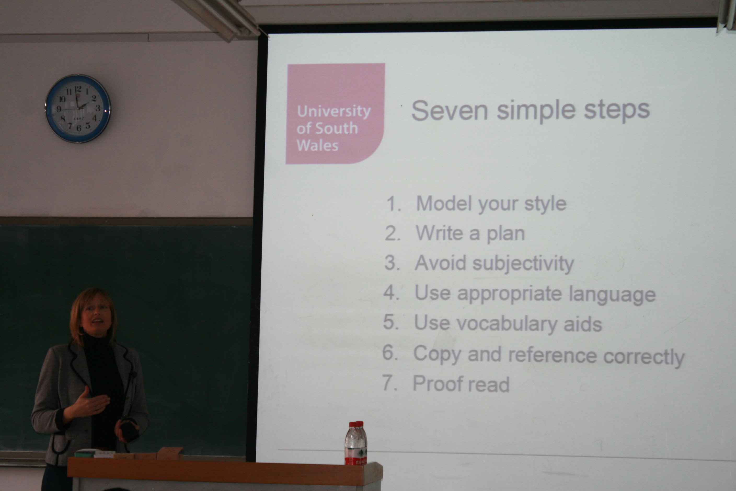 海伦·康妮女士从英语学习方法与技巧方面做了深刻讲解,以其生动的课堂实践教学方法与学生现场互动、提问作答。同时,她还演示了英语教学和学习方法与技巧,对英语雅思(IELTS)教学也作了讲解。报告会最后,海伦·康妮女士与在场师生进行了互动交流。