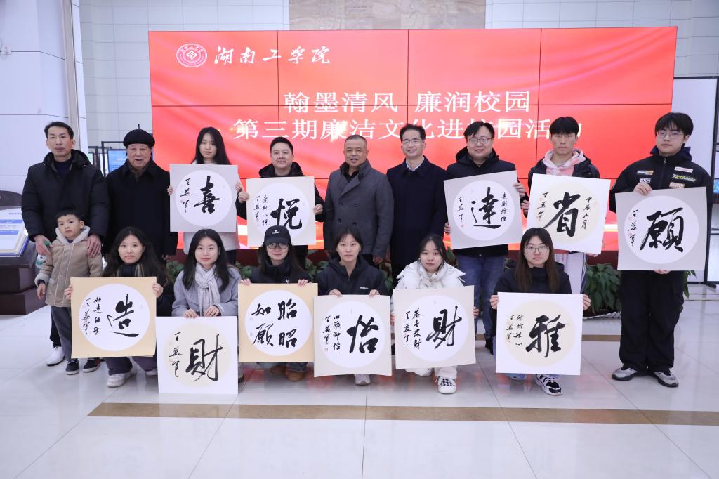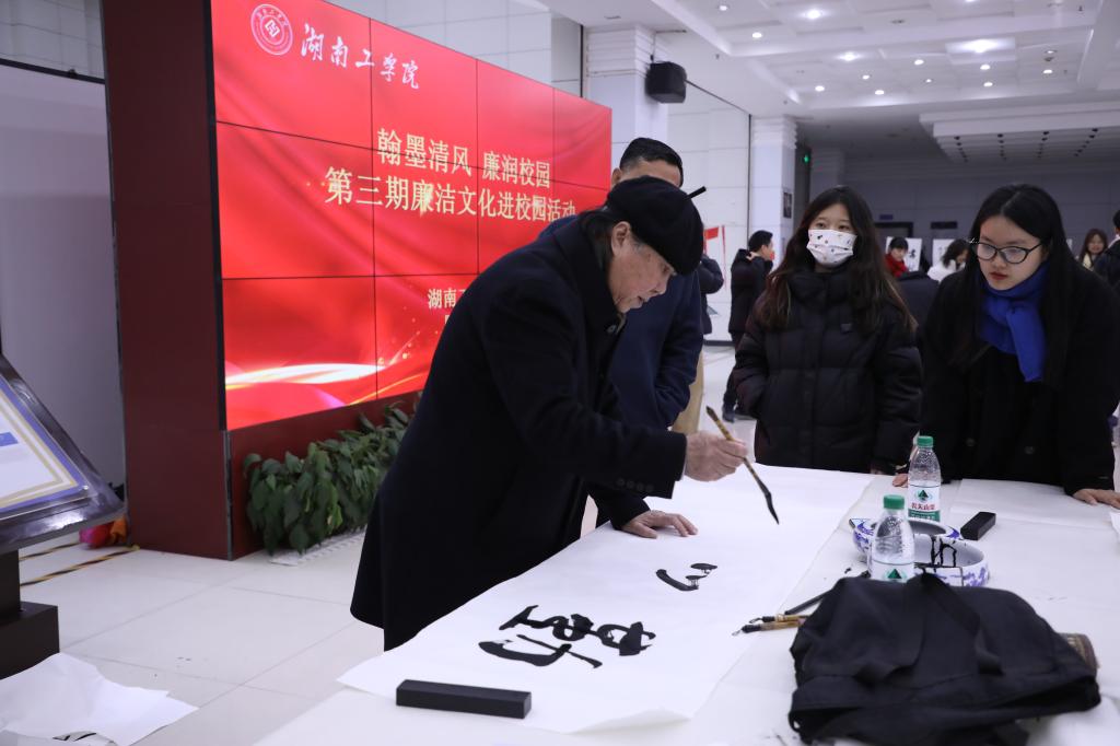 活动中,由雁城书画院院长王益军带队,舒迪柔、毛增禄、罗红卫、易正华衡阳书法名家与现场的师生们一起创作书法作品,交流创作技艺和心得,现场气氛热烈。字里行间尽显廉洁文化的精神,给师生们留下了深刻的印象。活动在图书馆一楼大厅设置“廉洁长廊”开展雁城书画院beat365官网书法协会师生书法作品展,通过生动的笔触展现了廉洁的内涵与意义,吸引了众多师生驻足观看。