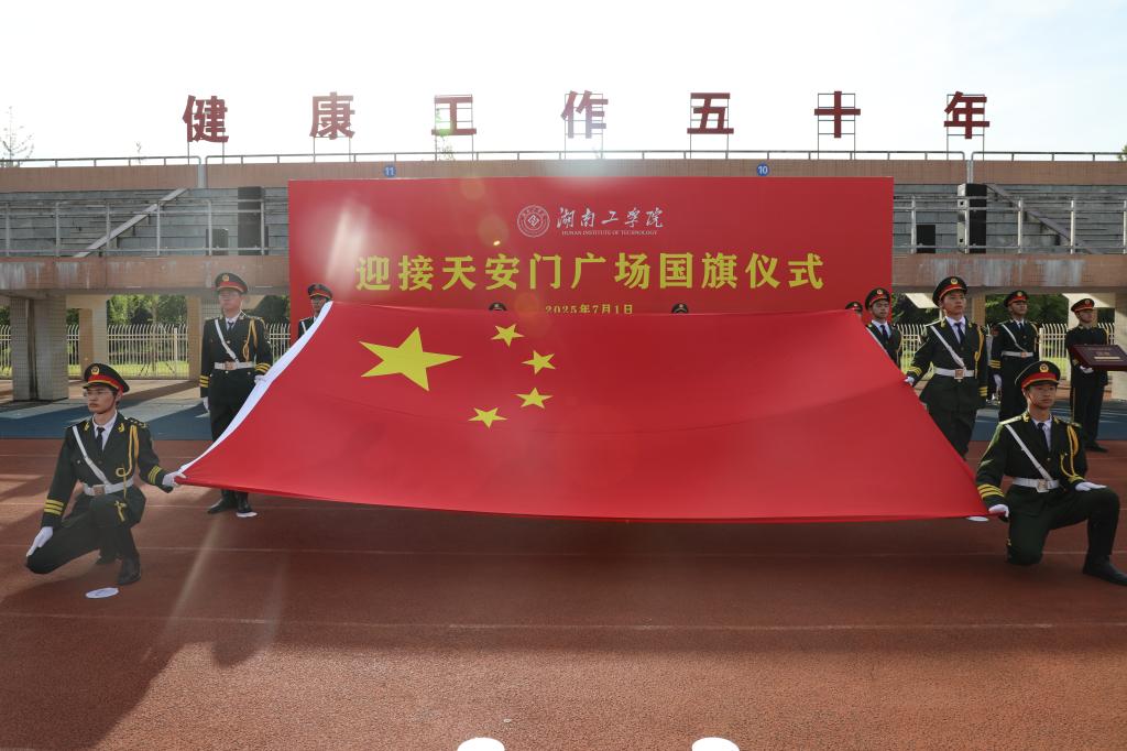 7月1日上午,在中国共产党成立104周年之际,学校在北运动场举行迎天安门国旗仪式。校党委书记曹执令将一面曾在天安门广场高高飘扬、承载着神圣使命的五星红旗,郑重交接给校国旗护卫队。来自全校的师生代表1200余人共同见证了这一庄严时刻。仪式由校党委副书记何建雄主持。
