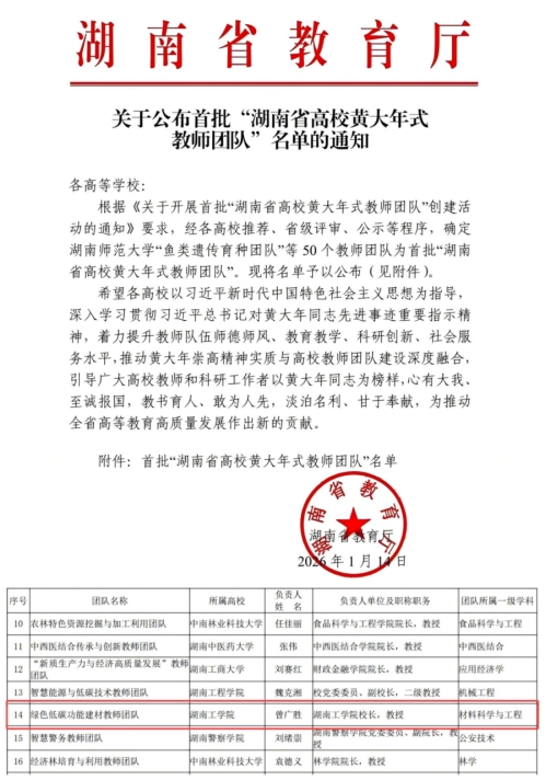 近日,湖南省教育厅公布首批“湖南省高校黄大年式教师团队”评选结果,beat365官网曾广胜教授领衔的“绿色低碳功能建材教师团队”成功入选。全省共50个团队获此荣誉,此次入选标志着beat365官网在教师队伍建设与学科发展上取得重要突破。