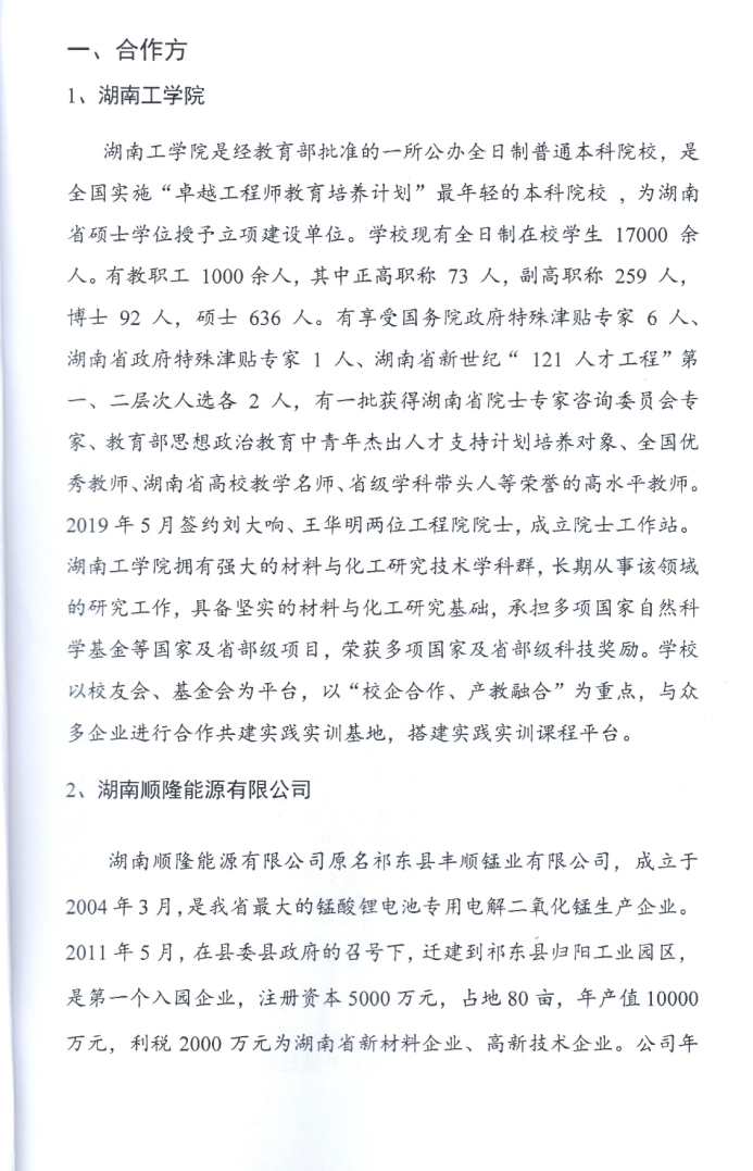 利用本学科人员与实验条件,为湖南地区高固体废弃物排放企业提供研发服务,为固体废弃物建材资源化利用开辟了新途径,为治理环境污染做出了重要贡献,也为相关排放企业提供了生存机会,促进了工业产业协调发展,为地方经济发展做出了贡献。近年来相继为湘潭电化废弃物处理企业湘潭市华?环保科技有限公司提供“电解二氧化锰复合料及其应用的试验研究”,为衡阳市建衡化工有限司提供“硫酸铝与聚合氯化铝资源化处理应用”研究,为湖南顺隆能源有限公司(衡阳祁东)提供“电解二氧化锰废渣资源化处理试验研究”等研究开发服务。具体实例如beat365正版唯一官网必一-湖南顺隆能源有限公司合作组建湖南省锰酸锂用电解二氧化锰绿色生产与应用技术工程研究院中心。 协议如下: