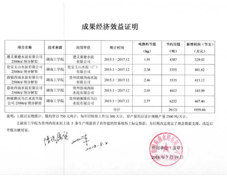 “电解二氧化锰废渣资源化利用”成果在湖南金山水泥有限公司产生的经济效益证明材料