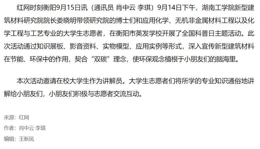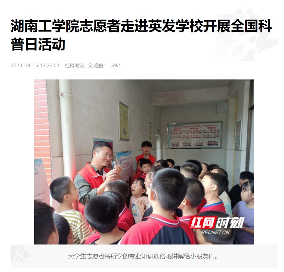 红网时刻:beat365正版唯一官网必一志愿者走进英发学校开展全国科普日活动
