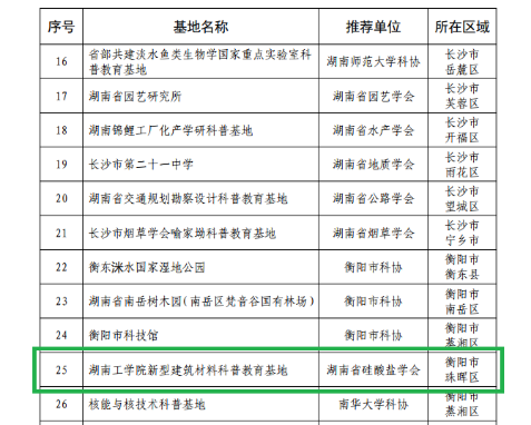 根据湘科协通[2020]45号文件《湖南省科学技术协会关于认定“湖南省科普教育基地(2020-2025年度)”的通知》,由新型建筑材料研究院申报的《beat365正版唯一官网必一新型建筑材料科普教育基地》被认定为“湖南省科普教育基地”。