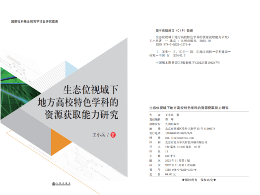 近日,商学院院长王小兵教授主持的国家社科基金项目阶段性成果《生态位视域下地方高校特色学科的资源获取能力研究》在国家级出版社九州出版社出版发行。全书分八章,25万字,主要包括前言绪论资源获取与学科生态位的关系研究社会资本:学科生态位内涵和路径重构的催化剂学科群:特色学科生态化发展的高级组织形式人力资源及其柔性:地方高校学科生态位提升的关键性资源政策性资源对地方高校学科生态位跃升的实证研究地方性:地方高校学科生态位的属性特征及建设路径基于资源瓶颈突破的地方高校学科建设的路径选择案例分析:高水平行业特色高校建设的战略思维与实现路径等。