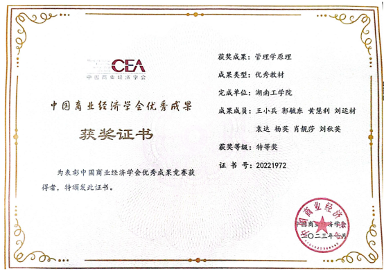 近日,中国商业经济学会发布了“第一届中国商业经济学会优秀成果竞赛工作获奖名单”的公示通知,经过业内专家通讯初评、评审委员会复评、研究会终评后公示,决定授予优秀教学成果、优秀教材、优秀著作共112项,其中优秀教材特等奖2项、一等奖4项、三等奖7项。由我院王小兵教授主编的《管理学原理》荣获优秀教材特等奖。