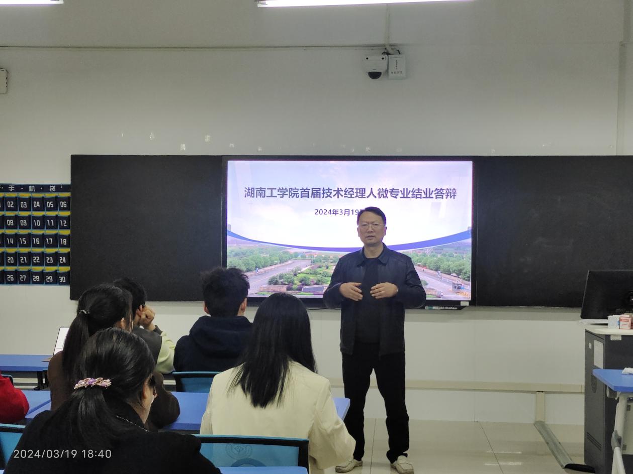 答辩会前,王小兵即兴做开场发言,首先,对于参加结业答辩即将顺利毕业的同学表示热烈祝贺,对全体任课教师克服困难、抽出时间完成微专业的教学任务表示衷心感谢;其次,希望同学们以成为学校首届技术经理人的学员为荣,作为湖南省首家面向本科层次的技术经理人微专业,自开办以来,得到了湖南省科技厅、衡阳市科技局、湖南省知识产权中心等各界领导的亲切关怀,得到了湖南教育电视台等多家媒体广泛报道,影响深远。将学校打造成技术经理人培养的基地,技术经理人微专业的开设,是商学院响应政府号召进行教育创新的重要尝试。他指出,随着科技的快速发展和经济全球化的深入,对技术管理人才的需求日益增长。商学院通过这一微专业,为社会培养了一批既懂技术又通管理的优秀人才,这对于推动行业进步和经济发展具有重要意义。最后,嘱托同学答辩通过后,还需继续努力,利用微专业学习的知识结合自己的学科专业背景,为成果转移转化贡献自己的力量。学院也会整合校企资源,为有志从事技术经理人事业的同学提供施展才华的机会。