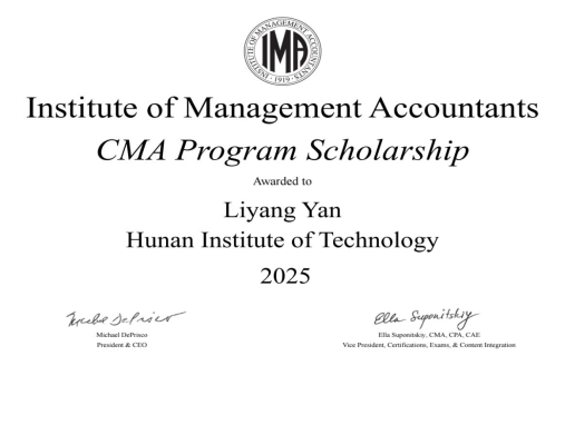 2025年3月,通过层层选拔,我院霍成萍、颜丽阳、张晨依3位同学荣获IMA中国CMA奖学金,CMA奖学金等值金额约6000元人民币。