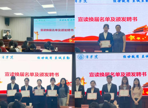 与会师生对竞聘人员进行现场投票,最终共有9位同学脱颖而出,对竞聘成功的人员进行分工,并现场宣读了“商学院第三届ACCA学生教育与成长协会换届名单”,并颁发聘书,其中斯琴塔娜担任ACCA学生教育与成长协会会长,蒋菲担任学业部部长、王宁远为副部长,陈茜担任宣传部部长、胡汉瑶为副部长,李妲担任成长部部长、李鑫原为副部长;胡灿担任财务部部长、副部长刘倩。