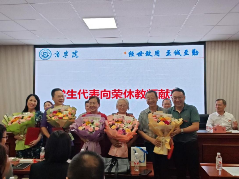 曹文明做总结讲话,他再次感谢六位荣休老教授为商学院发展做出了突出贡献。他也期待六位新进老师秉承“勤学、务实、圆融、卓越”的校训精神,团结协作、攻坚克难,为学院的教育教学、科研创新、党建学工贡献青春力量。他希望学院全体教职工大力弘扬教育家精神,牢记为党育人、为国育才的初心使命,争做“四有”好老师,当好“四个引路人”,以更加饱满的热情、更加扎实的作风、更加优异的业绩,推动商学院高质量发展!