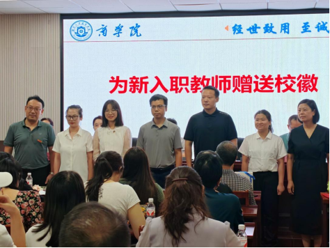 周斌为2025年新入职的段敏静、罗恺凯、凌暄、马点圆、李友元、彭天琼老师赠送校徽。