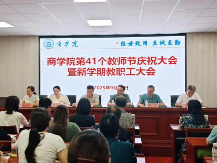 2025年9月10日下午,商学院于经管楼302召开学院第41个教师节庆祝大会暨新学期教职工大会,组织部副部长曹文明、人事处副处长周斌、商学院全体教职工参会,会议由院党委书记李光红主持。