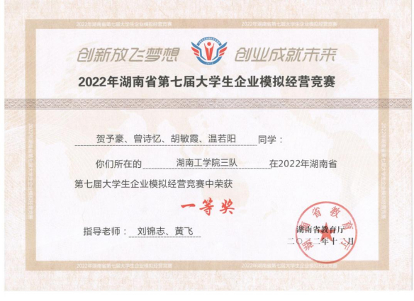 省级优秀指导教师(政府类):2人次,刘锦志(企业经营模拟)、刘锦志(酒店管理商业策划) 省级优秀指导教师(榜单类):4人次,黄飞、张诗菡、刘锦志、朱送花(学创杯) 省级优秀组织奖(政府类):企业经营模拟大赛、电子商务大赛、财务大数据应用能力竞赛 |