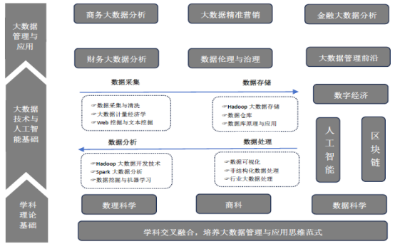紧紧围绕“学科交叉,产学研融通”培养路径,成立由行家里手、专业带头人、骨干教师、课程负责人等组成的课程体系开发团队,构建由基本素质模块、专业基础模块、专业理论模块、职业技能模块、职业态度模块五个部分组成,以实操能力培养为核心,知识、能力、素质并重的新型课程体系。重点建设以数据结构和数据库原理、数据采集与数据分析、商科大数据分析为核心的三大课程群。努力建设课程体系、教学形态、教学质量“三位一体”的高标准课程体系。